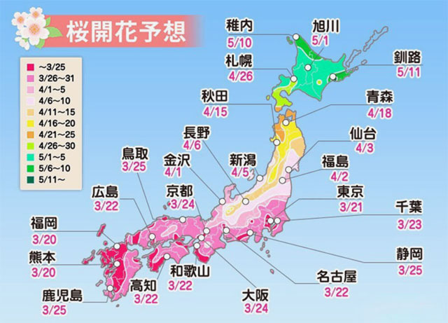 Официально цветение сакуры в Токио приходится на период с 27 марта по 7 апреля, а в Киото — с 4 по 16 апреля. Однако даты эти приблизительные: погода может внести существенные коррективы. Если перед началом цветения было тепло, деревья могут расцвести на неделю-две раньше. В холодную же погоду цветение начинается намного позже.